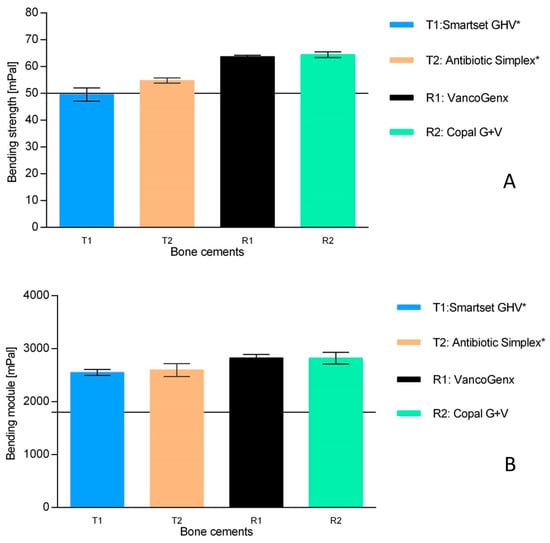 As the antibiotic particles are not incorporated in the polymer matrix, they are a foreign body in the cured cement, and this is necessary for their release. Especially for mechanical reasons, it is crucial that the quantity of 4 g of antibiotics per 40 g of cement powder is not exceeded [10]. No significant differences in the ISO bending modules could be detected in the study, but the ISO bending strength of the test group was substantially reduced by approximately 20% in comparison to the references not altered [42]. A high reduction in the ISO bending strength of Smartset GHV (T1) from approximately 66 MPa to 49.4 MPa after the manual addition of 2 g V was reported by [19].