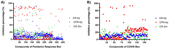 Initial screening results for the boxes. (A) Among the PRB compounds evaluated against CPR-Kp, 38 exhibited inhibition percentages above 80%, with five exhibiting exceptionally high inhibition rates of above 90%: fusidic acid, MMV1580853, and MMV1634399. Only two PRB compounds exhibited an inhibition percentage above 80%: gepotidacin and MMV1634402 for CR-Kp, and against CR-Sm, trimethoprim exhibited a remarkable inhibition percentage of 82.14%. (B) Among the CB compounds evaluated against CPR-Kp, four compounds, oxyclozanide, doxorubicin, simeprevir, and niclosamide, exhibited inhibition rates above 80%.