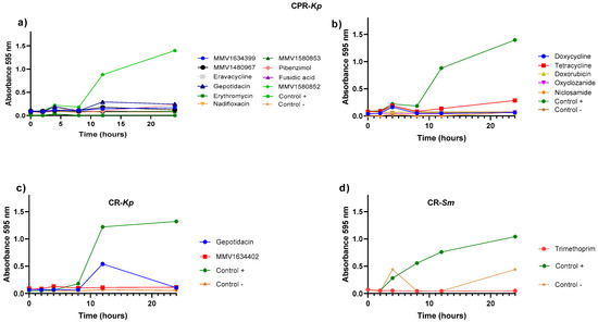 Elimination time kinetics of different antibacterial agents against the growth curves of selected bacterial strains under the effect of different compounds from PRB and CB. (a) Survival curve (over 24 h) for CPR-Kp when treated with the compounds from PRB: MMV1634399, MMV1580853, fusidic acid, nadifloxacin, MMV1480967, eberconazole, gepotidacin, erythromycin, pibenzimol, eravacycline, and MMV1580852. (b) Survival curve (over 24 h) for CPR-Kp when treated with the compounds from CB: doxycycline tetracycline, doxorubicin, oxyclozanide, and niclosamide. (c) Survival curve (over 24 h) for CR-Kp when treated with the PRB compounds: gepotidacin and MMV1634402. (d) Survival curve (over 24 h) for CR-Sm when treated with the compounds from PRB: trimethoprim. All tests were performed in duplicate. Each point represents the average of duplicate determinations.