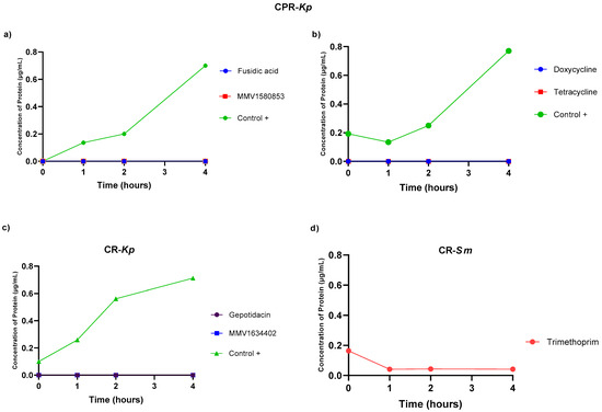 The number of proteins released over time, reflecting the integrity of the cell membrane when the bacterial strains were exposed to the compounds from PRB and CB, are depicted. (a) Extravasation of CPR-Kp proteins; (b) extravasation of CPR-Kp proteins; (c) extravasation of CR-Kp proteins; (d) extravasation of CR-Sm proteins. The data points represent the averages of the protein concentration values measured at 0, 1, 2, and 4 h post-treatment, providing insights into the temporal dynamics of bacterial membrane damage. All tests were performed in duplicate. Each point represents the average of duplicate determinations.