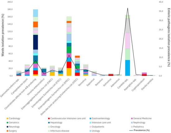 The prevalence rate was obtained by calculating the ratio between the number of positive isolates and the total number of requests for each enteric pathogen, according to the different wards. The most prevalent bacteria was EPEC (121/1086, 11.1%), mostly found in the Cardiology (4/19, 21%), Nephrology (6/32, 18.8%), and Cardiovascular Intensive Care (4/23, 17.4%) Units, followed by C. difficile toxin A/B-producing strains (158/1896, 8.3%), STEC (35/1086, 3.2%), EAEC (34/1086, 3.13%), C. jejuni (27/1091, 2.5%), S. enterica, Y. enterocolitica, and ETEC with about 1% of prevalence (Figure 1). The circulation of C. difficile toxin A/B-producing strains was most prevalent in the Neurology (2/5, 40%), Hepatology (5/31, 16.1%), Surgery (9/58, 16.5%), Infectious Disease (29/225, 12.9%), and Cardiovascular Intensive Care (5/46, 11%) wards (Figure 1). However, Norovirus was the most prevalent (30/875, 3.4%) and was mostly found in Pediatrics (11/170, 6.5%), followed by Sapovirus (15/875, 1.7%), while Astrovirus, Rotavirus, and Adenovirus had a prevalence of about 0.6% (Figure 2). With regard to opportunistic infections, Candida spp. was the most prevalent (197/536, 36.7%) and was most commonly found in pediatric patients, patients from the Gastroenterology Unit, and outpatients (Figure 1). Aspergillus spp. infection had a prevalence of 0.8%, mainly in pediatric patients and outpatients (0.9%). Only 0.2% of AID cases was observed to be caused by parasitic infection in the Oncology and Cardiovascular Intensive Care Units.