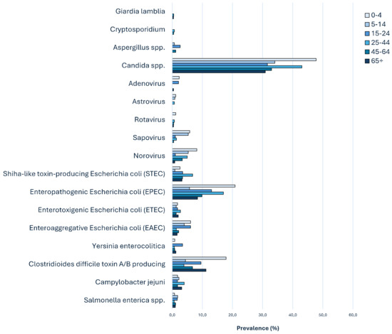 EPEC showed a higher prevalence in early childhood, particularly in the 0–4 age group (24/115, 20.8%), followed by the 25–44 (25/147, 17%), the 15–24 (15/115, 13%), the 45–64 (23/233, 9.9%), the over-65 (21/249, 8.4%), and the 5–14 (13/227, 5.7%) age groups. C. difficile toxin A/B-producing strains were most prevalent in the 0–4 age group (22/123, 17.8%), followed by the over-65 (65/580, 11.21%), the 15–24 (17/178, 9.6%), the 45–64 (32/477, 7.7%), the 5–14 (10/228, 4.3%), and the 25–44 (12/310, 3.9%) age groups. EAEC showed a prevalence of 6.1% in both the 0–4 and 15–24 age groups, followed by the 5–14 (9/227, 4%) and the 45–64 (5/233, 2.2%) age groups, while the 25–44 and the over-65 age groups had a prevalence of about 1% (Figure 2). STEC infection was most prevalent among adults, including the 25–44 age group (10/147, 6.8%), followed by all other age groups with around 3% frequency (Figure 2). C. jejuni circulated mainly in the 25–44 (6/151, 4%) and the over-65 (8/253, 3.2%) age groups, followed by the others with a prevalence of around 2% (Figure 3). S. enterica infection was observed in the 0–4 and 5–14 age groups with a percentage of 1.6–1.8%, followed by the others with frequencies ranging from 0.7 to 1.1% (Figure 2). Y. enterocolitica circulation was observed the most in the 15–24 age group (4/117, 3.4%), followed by the oldest group (3/247, 1.2%) (Figure 2). ETEC showed the highest prevalence (2 to 2.7%) in adults from the 25–44 and the over-65 age groups, followed by the others ranging from 1.7 to 1.3% (Figure 2). Norovirus was most prevalent in the youngest groups, particularly in the 0–4 (7/86, 8.1%) age group, followed by the 5–14 (6/113) and the 25–44 (7/140) age groups with a frequency of 5%. A similar age distribution was observed for Astrovirus, Rotavirus, and Adenovirus. Candida spp. showed a high prevalence in all age groups, but it was particularly common in the 0–4 age group (43/90, 47.8%), while Aspergillus spp. infection was most commonly observed in patients belonging to the 15–24 age group (2/76, 2.6%). Cryptosporidium was isolated from two 39- and 54-year-old patients, while G. lamblia was isolated from two 52- and 75-year-old patients (Figure 2).