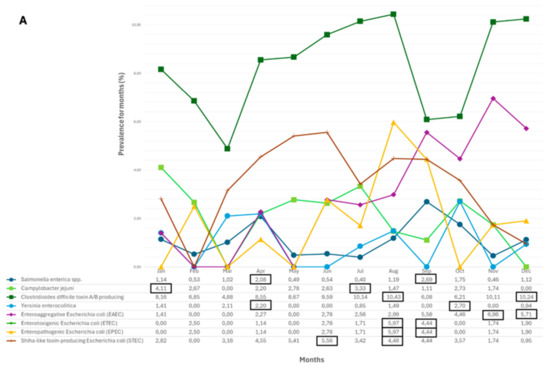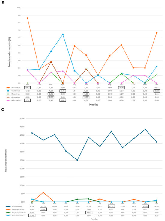 With regard to seasonal trends, Figure 3 shows the prevalence of each enteric pathogen, subdivided into bacterial (Figure 3A), viral (Figure 3B), and fungal/parasitic pathogens (Figure 3C). Among the bacteria, S. enterica and Y. enterocolitica exhibit two seasonal peaks, primarily in spring (April) and in autumn (September-October). C. jejuni and C. difficile toxin A/B-producing strains have a higher prevalence in winter (December–January) and summer (July–August). ETEC and EPEC primarily circulate in summer (August) and autumn (September). The other two E. coli serotypes, EAEC and STEC, show a respective higher prevalence in winter (November–December) and summer (June–August) (Figure 3A). As for the viruses (Figure 3B), Norovirus circulates exclusively in winter (December–January), while Sapovirus and Adenovirus are present both in winter (December–January) and in spring (April). Rotavirus and Adenovirus show a spike in frequency that takes place in March (1.41%) and June (1.85%), respectively. The spikes in frequency (1.85%) of Astrovirus and Rotavirus overlap in June. Candida spp., which exhibits a significantly higher prevalence compared to the other enteric opportunistic pathogens evaluated, shows two peaks that take place in summer (August) and autumn (November) (Figure 3C).
