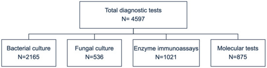 Between 1 January, 2018 and 31 December, 2023, a total of 2863 patients (from 0 to 99 years old) admitted to the “R. Dulbecco” University Hospital of Catanzaro were screened for suspected AID. The monocentric study did not include clinical information (e.g., vaccination status, symptoms, and signs), coinfections were not considered, and each pathogen was counted as a single infection. Patients’ demographic information was recorded in an anonymized database at the moment of admittance. The study was conducted in accordance with the Declaration of Helsinki and approved by the Ethics Committee of the Calabria Region (protocol code #130 and date of approval 23 April 2024). Diagnostic tests were performed during hospitalization or during routine diagnosis for outpatients according to clinical query (Figure 4).