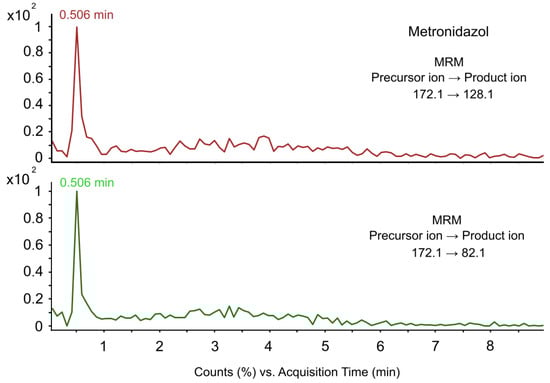 Then, we performed additional screening of drugs whose content in food products is regulated by GOST. The results of these analyses are presented in Table 2. The following precursor and product ions of drugs were detected in all 16 samples of amphipod species E. verrucosus: chlortetracycline, doxycycline, oxytetracycline and metronidazole. Selective molecular ions of amikacin, dimetridazole and spiramycin were detected in several samples of amphipods. Molecular ions of dimetridazole were detected in 11 out of 16 samples (level of contamination: 69%; mean 0.69; SD 0.12; variance 0.23). Molecular ions of spiramycin were detected in 4 samples (level of contamination: 25%; mean 0.25; SD 0.1; variance 0.20). Ions of amikacin were detected in 15 out of 16 samples (level of contamination: 94%; mean 0.93; SD 0.06; variance 0.06). Figure 1 shows the chromatograms of metronidazole, including the chromatograms of precursor and product ions. The typical raw data chromatograms of these analyses are presented in Supplementary Materials S1, Figures S1–S9.