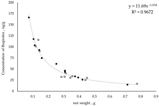 Correlation between concentration of ibuprofen and the wet weight of species E. verrucosus amphipods, ng/g (white marker—2020; black marker—2022).