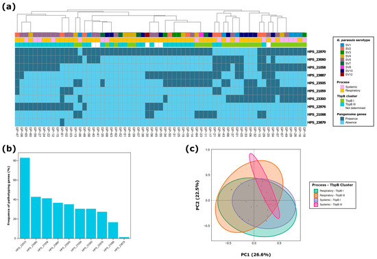 Pathotype characterization of 65 G. parasuis isolates from Spanish swine farms: (a) pathotype clustering based on the presence of ten pangenome genes, using the unweighted pair group method with arithmetic mean (UPGMA) as the hierarchical clustering method; (b) frequency (%) of each pathotype gene; and (c) principal component analysis (PCA) of the ten evaluated pangenome genes, showing grouping based on pathologic process and TbpB cluster of each G. parasuis isolate.