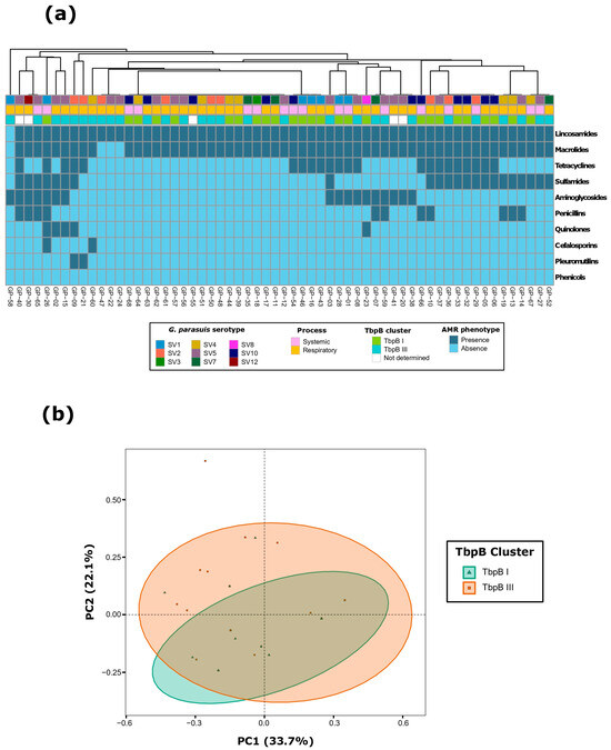 Antimicrobial resistance (AMR) characterization at the class level of 60 G. parasuis isolates from Spanish swine farms: (a) AMR phenotype clustering based on antimicrobial classes, using the unweighted pair group method with arithmetic mean (UPGMA) as the hierarchical clustering method, and (b) principal component analysis (PCA) of the AMR patterns, showing grouping based on the TbpB cluster of each G. parasuis isolate.