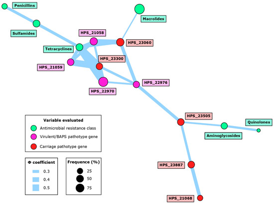 Within pathotype genes, 11 significant cooccurrences were appreciated, with the notable association between carriage HPS_23300 and virulent HPS_21059 (p < 0.0001; Φ = 0.53) or between carriage HPS_23060 and virulent HPS_21058 (p < 0.001; Φ = 0.43). We could also determine three associations between AMR phenotypes, remarking the interaction between sulfonamides and tetracyclines (p < 0.05; Φ = 0.32). All these findings demonstrate the complexity of the interactions between AMR and pathotype genes.