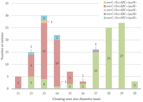 The results of sensitivity testing of the isolates to BC are presented in Figure 1 in the form of a histogram. The histogram shows the distribution of particular sizes of the clearing zones achieved around the spot of BC solution (6 mg/mL) placement in an agar diffusion assay. Additionally, five gene profiles achieved for the three QACs-resistance associated genes are indicated on the bars with colors, according to the legend.
