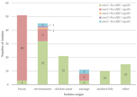 A clear pattern between an isolate origin and their QACs resistance gene profile can be observed. In the collection, there were 51 isolates originating from bacon (collected over the period of 13 months), and 48 of them had the emrC gene. All those 48 isolates had reduced sensitivity to BC in the phenotypic analysis. Resistance to QACs could be a potential reason for the persistent presence of L. monocytogenes in bacon samples, as their eradication from the processing plant could be impaired. Apart from bacon samples, 13 environmental samples (out of which 9 originate from sewage drain swabs) and 8 sausage samples had isolates with at least one QACs resistance-related gene. A bar chart showing the sources of the isolates along with their gene profiles is presented in Figure 2.