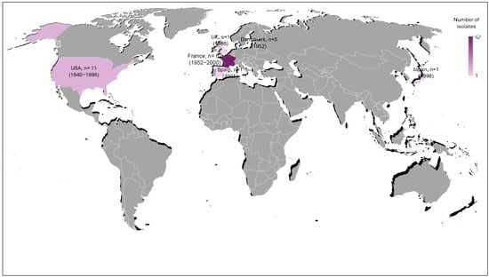 Geographical distribution of H. infuenzae isolates used in this study. The number of isolates is indicated for each country and the period of isolation is indicated between parentheses. The color intensity is proportional to the number of isolates.