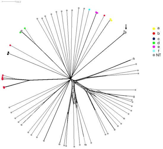 Whole genome sequences were also performed on all 81 isolates and compared by a gene-by-gene approach using the 1037 gene of core-genome MLST (cgMLST) available on the PUBMLST.org database (accessed on 2 August 2023) [23]. The genome-based prediction of the capsule correlated with the PCR-based serotyping. The cgMLST-based tree showed the highly heterogeneous structure of the isolates, particularly the NT isolates, as the serotypeable isolates were clustered together according to each serotype (Figure 1). Notably, four NT isolates (Supplementary Table S1 IDs 15135, 15137, 15160, and 15165) clustered with the serotype d-specific branch and belonged to the most detected clonal complex within this serotype (CC10). These isolates may have lost their capsule locus. Conversely, two serotype b isolates (Supplementary Table S1 IDs 15099 and 15171) were clustered among NT isolates, suggesting acquisition of the capsule locus. These results point out the genetic diversity among Hi isolates. Five of the eighty-one isolates (Supplementary Table S1 IDs 15098, 15107, 15116, 15131, and 15132) were identified by WGS as Haemophilus quentini and were clustered together but not separated from the other seventy-six isolates. These five isolates were all from France between 1984 and 1986 (Figure 2). These isolates were kept in the analysis and were from both invasive and non-invasive infections (Supplementary Table S1).