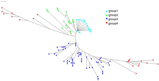 The 21 predicted amino acid sequences of the 207 aa domains were aligned together with the identified ftsI allele sequences in H. influenzae that we have previously reported [11]. A total of 160 unique amino acid sequences were therefore aligned and the corresponding phylogenetic tree was visualized using SplitsTree (version 4.14.6). The 21 PBP3 sequences identified in this study were localized on several regions of the phylogenetic tree within the four already identified groups of PBP3 (Figure 4). Most of the 21 PBP3 predicted sequences belonged to groups 1 and 2, which corresponded to beta-lactam-susceptible isolates. Several alleles were represented by several isolates with allele ftsI10 (group 1), which was the most frequently encountered among the 81 isolates of this study (17 isolates; 21.0%). ftsI alleles of group 3 were detected (n = 13) and corresponded to 14 isolates, among which, 10 isolates were beta-lactamase-negative and resistant to amoxicillin and amoxicillin+clavulanic acid but susceptible to cefotaxim. Four isolates were both beta-lactamase-positive and harbored alterations in PBP3 (Supplementary Table S1 IDs 15143, 15144, 15151, and 15152). One isolate (Supplementary Table S1 ID 15154) harbored a ftsI allele of group 4 (ftsI40) and corresponded to the unique isolate that was resistant to amoxicillin, amoxicillin + clavulanic acid, and cefotaxime. This isolate was also resistant to ceftriaxone (Supplementary Table S1).