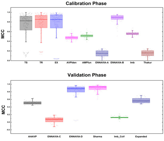 This segment focuses on managing the initial number of 210 models via a reduction process. In the preliminary phase of the calibration, an evaluation of these 210 models was conducted utilising three datasets: TR StarPep, TS StarPep, and EX StarPep. These datasets, predominantly derived from StarPepDB, demonstrated relatively uniform behaviours across the models’ performances, as depicted in Figure 1. Such an outcome is expected, considering the considerable overlap in the sequences shared between these datasets and the employed “query”.