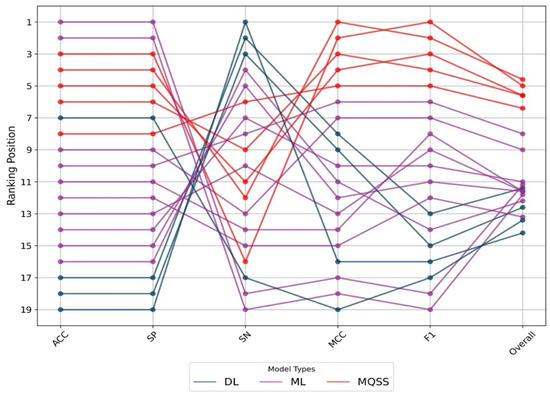 Figure 2. Ranking fluctuation in each of the performance metrics for deep-learning (DL), machine-learning (ML), and MQSS models. ACC = accuracy; SP = specificity; SN = sensitivity; MCC = Mathew’s correlation coefficient; F1 = F1 score.