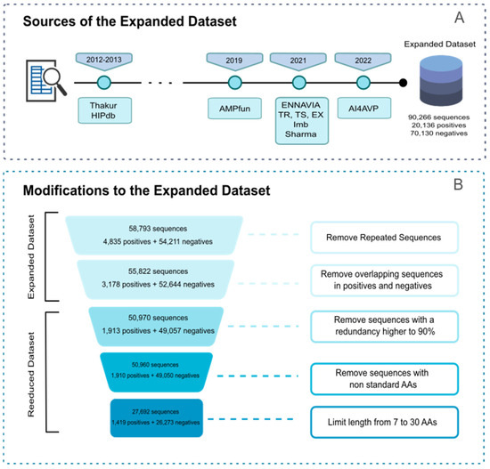 Furthermore, we created two new datasets, amassing a total of 20,136 positive sequences and 70,130 negative sequences. These 90,266 sequences underwent several filters to eliminate redundancy, resulting in an “expanded” dataset comprising 55,822 sequences, including 3178 positive and 52,644 negative sequences. The different sources for the “expanded” dataset are specified in Scheme 2.