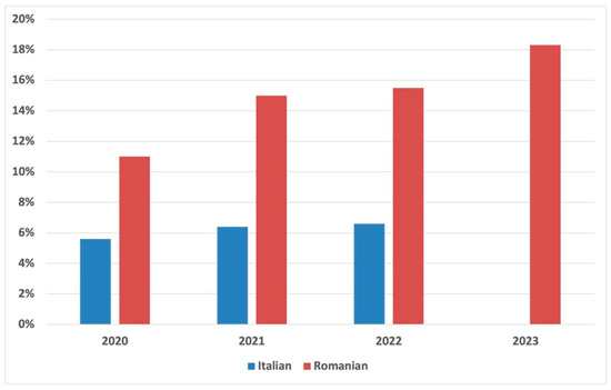 A secondary aim was to assess the prevalence of CDI in different hospital settings. In this regard, our data showed a prevalence of CDI of 4.7% (44/934) among Italian patients and 15.2% (186/1224) among Romanians. Considering the prevalence by year (Figure 1), the trend was stable for the Italian cohort (around 6% from 2020 to 2022), except for 2023, where no positivity was recorded. At the same time, considering the Romanian cohort, the trend increased from 11% in 2020 to 18.3% in 2023.