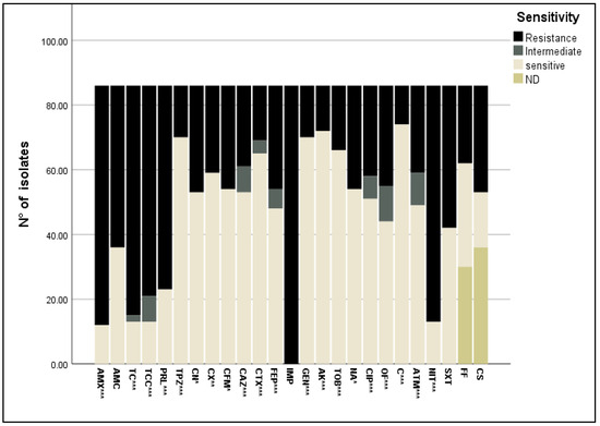 Antibiotic resistance profile of E. coli isolates towards 25 antibiotics belonging to nine classes. *: p < 0.05; **: p < 0.01; ***: p < 0.0001. AMX: amoxicillin, AMC: amoxicillin + clavulanic acid, TC: ticarcillin, TCC; ticarcillin + clavulanic acid, PRL: piperacillin, TPZ: piperacillin + tazobactam, CN: cephalexin, CX: cefoxitin, CFM: cefixime, CAZ: ceftazidime, CTX: cefotaxime, FEP: cefipime, IMP: imipenem, GEN: gentamycin, AK: amikacin, TOB: tobramycin, NA: nalidixic acid, CIP: ciprofloxacin, OF: ofloxacin, C: chloramphenicol, ATM: aztreonam, NIT: nitrofurantoin, SXT: trimethoprim-sulfamethoxazole, FF: fosfomycin, CS: colistin, ND: not determined.