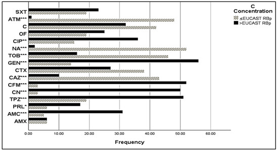 MIC of sensitive E. coli isolates. C Concentration stands for Critical Concentration; EUCAST RBp stands for EUCAST Resistant Break point; *: signification (p < 0.05); **: signification (p < 0.01); ***: signification (p < 0.001). AMX: amoxicillin, AMC: amoxicillin + clavulanic acid, TC: ticarcillin, PRL: piperacillin, TPZ: piperacillin + tazobactam, CN: cephalexin, CFM: cefixime, CAZ: ceftazidime, CTX: cefotaxime, GEN: gentamycin, TOB: tobramycin, NA: nalidixic acid, CIP: ciprofloxacin, OF: ofloxacin, C: chloramphenicol, ATM: aztreonam, SXT: trimethoprim/sulfamethoxazole.