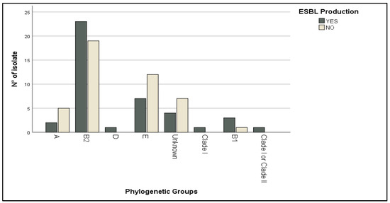 Distribution of ESBL-producing strains according to phylogenetic groups.