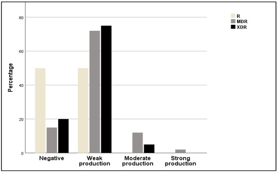 Relative frequencies of resistant (R), multidrug-resistant (MDR), and extensively drug resistant (XDR) strains among non-producers and weak, moderate, and strong biofilm producers.