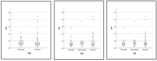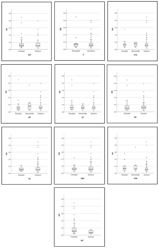 In addition, the optical density (OD) of biofilms was compared across the resistance profile (sensitive, intermediate, and resistant strains) for each of the antibiotics tested in this study (Figure 6). The analysis revealed that there was no difference in the OD value of biofilm activity between the resistant, sensitive, and intermediate strains to each of the antibiotics. In this case, the biofilm-forming ability was not associated with the resistance profile of strains; as an exception, the nitrofurantoin-resistant strains produced more biofilms than the sensitive strains with a statistically significant difference (p = 0. 012).