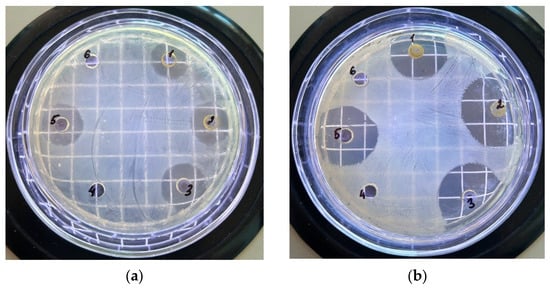 Appearance of the Petri dish field after 24 h of inoculation of C. michiganensis (a) and E. carotovora (b) cultures when exposed to G. uliginosum extract: flowers (1), leaves (2), total biomass (ultrasound treatment) (3), roots (4), total biomass (maceration) (5), stems (6).