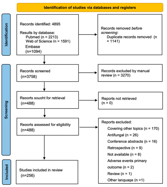 A total of 4895 articles were identified through computer searches in the selected databases, with 1141 duplicates removed through electronic or manual methods. A total of 3754 studies were screened by title and abstract and 489 were assessed for eligibility by full-text assessment. A total of 256 studies were finally included in the systematic review (Figure 1). Detailed reporting quality and risk-of-bias assessments are presented in Figures S1 and S2 (Supplementary Materials; File S3).