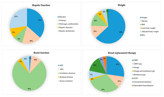 All studies meeting these criteria were included, regardless of whether they focused on these factors as primary objectives or not, analyzed risk factors or directly assessed a population subgroup (e.g., obese patients, those undergoing continuous RRT, ECMO, etc.), studied antibiotic exposure (typically through plasma concentrations), or examined the impact on pharmacokinetic parameters. We categorized covariates using a preplanned, custom classification based on patterns commonly identified in a preliminary literature review conducted by the authors. Given the nature of this review, no formal sensitivity or subgroup analyses were prespecified to assess heterogenicity. Studies not in English or Spanish, retrospective studies, reviews, and abstracts were excluded. Other exclusion criteria were studies that did not assess pharmacokinetic variability or exposure, those that exclusively focused on non-antibiotic agents such as antivirals or antifungals, and those for which full-text access was unavailable.