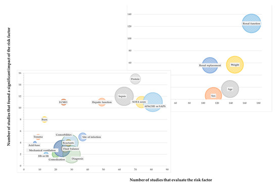 Some of the risk factors include different characteristics. Sepsis or septic shock was assessed based on the presence of these conditions, the use of vasopressors, or mean arterial pressure, while acute phase reactants were evaluated using C-reactive protein, fever, procalcitonin, or leukocyte count. Leukocyte count was the only factor among them that was not found to be relevant in any study. From studies concluding that blood protein levels were relevant, 86.67% included only albumin. Diabetes mellitus, congestive heart failure, cancer, chronic obstructive pulmonary disease (COPD), and neutropenia were the relevant associated comorbidities, all for beta-lactams except COPD, which was associated with vancomycin. The only two diagnoses associated with different outcomes were acute respiratory distress syndrome in one study and neurocritical in another. Midazolam was the determining comedication for daptomycin, and drug interactions with quinolones were significant. Types of infections showing differences were abdominal focus sepsis for aminoglycosides and beta-lactams, the Pitt bacteremia score for beta-lactams, and respiratory infections for linezolid and beta-lactams (one study for each). The details of the relevant risk factors that include more different variables can be seen in Figure 2 and Figure 3.