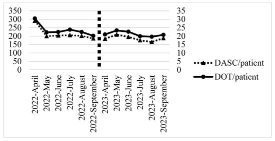 Figure 2 and Figure 3 show the monthly trends in the DOT/patient, DASC/patient, and DASC/DOT for all antibiotics administered from the start to the end of treatment during the baseline and intervention periods. Both the DASC/patient and DASC/DOT showed a decreasing trend starting from the first month of the intervention period.
