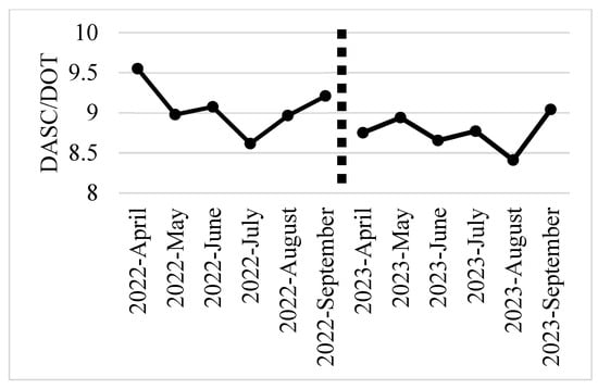 Monthly DASC/DOT of all antibiotics administered from the start to the end of treatment trends during the baseline and intervention periods. DOT, days of therapy; DASC, days of antibiotic spectrum coverage.