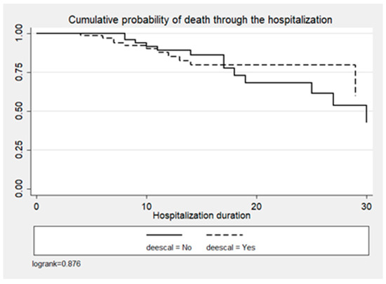 Survival analysis techniques, including multivariable Cox proportional hazards models, log-rank tests, and Kaplan–Meier curves, were conducted to evaluate the association of de-escalation to survival within 30 days upon hospital admission. Cumulative probability of recovery is presented as median (95% CI) time.