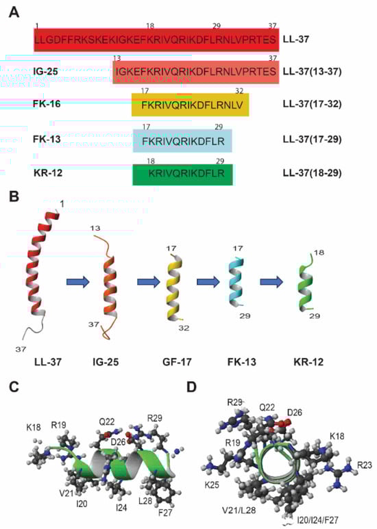 The discovery path of KR-12 through structural studies. (A) Amino acid sequences and nomenclature of LL-37 and its fragments. The original peptide names for these fragments are given on the right of the peptide sequences, while the shortened names are provided on the left. While LL-37 has a carboxylic acid at the C-terminus, the C-termini of shorter sequences, including FK-16/GF-17, FK-13, and KR-12, are all amidated to increase the net charge by +1. (B) Backbone structures of LL-37, IG-25, GF-17, FK-13, and KR-12 determined by 2D and 3D NMR spectroscopy [32,39,60]. Except for LL-37 and IG-25, GF-17, FK-13, and KR-12 are C-terminally amidated. (C,D) Horizontal and vertical views of the NMR structure of KR-12 in complex with anionic D8PG [32].
