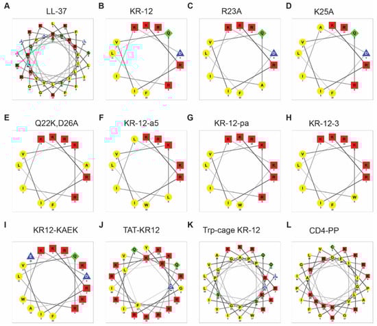 Helical wheel plots for LL-37 (A), KR-12 (B) and its selective derivatives (C–L). The helical wheel was generated using the NetWheel program (http://lbqp.unb.br/NetWheels/, accessed on 31 July 2024). In this program, amino acids are classified into four groups: (1) polar/basic (red square): RHK, (2) polar/acidic (blue triangle): DE, (3) polar/uncharged (green diamond): STNQC, and (4) nonpolar (yellow circle): AGVILMFYWP. Although included in the plot, it is evident that the HIV TAT sequence is not amphipathic (J). However, the amphipathic helical structure can still be seen in the presence of additional sequence from the Trp cage (K). Finally, some symmetry can be seen in the helical wheel plot of cyclic KR-12 dimer (L).