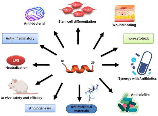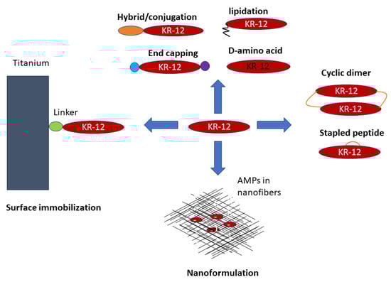 Like LL-37, KR-12 peptides also possess numerous desired properties such as antimicrobial, antibiofilm, and LPS neutralization. KR-12, as well as LL-37, has been covalently immobilized onto titanium (Ti) implants [123,124].