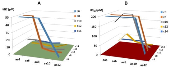2D array of the lengths of the KR-12 peptide with 4 to 12 amino acids (aa4 to aa12) and fatty acids (c6 to C14) for antibacterial activity (A) and hemolytic toxicity (B) uncovered a zone for designing selective lipopeptides. On the left, the closer the curves to the green plane, the more potent the peptides are. In contrast, the farther away from the red plane on the right, the less hemolytic the peptides are.