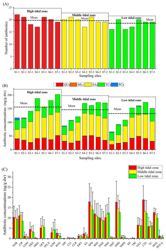 The numbers of detected antibiotics in high, middle, and low tidal zones were 25, 25, and 22, respectively (Figure 1A). There was no significant difference between the number of antibiotics among the three tidal zones. The mean antibiotic concentration in the high tidal zone was the highest (157.54 ± 33.84 ng/g dw), followed by that in the middle tidal zone (141.77 ± 35.39 ng/g dw), and the low tidal zone (129.36 ± 40.52 ng/g dw) (Figure 1B). Nevertheless, there were no significant differences between the mean antibiotic concentration among the three tidal zones. The difference in the distribution of antibiotics in the mangroves of Lianzhou Bay may be due to the direct discharge of wastewater from the local aquaculture pond with high antibiotic concentrations into the mangrove environment [11]. Additionally, the mangrove ecosystem has the capacity to accumulate or degrade various pollutants (antibiotics, trace metals, polycyclic aromatic hydrocarbons, etc.) from the land area [19,34]. Therefore, the mangrove ecosystem close to sewage outlets plays a crucial role in degrading significant amounts of antibiotics in sediments.