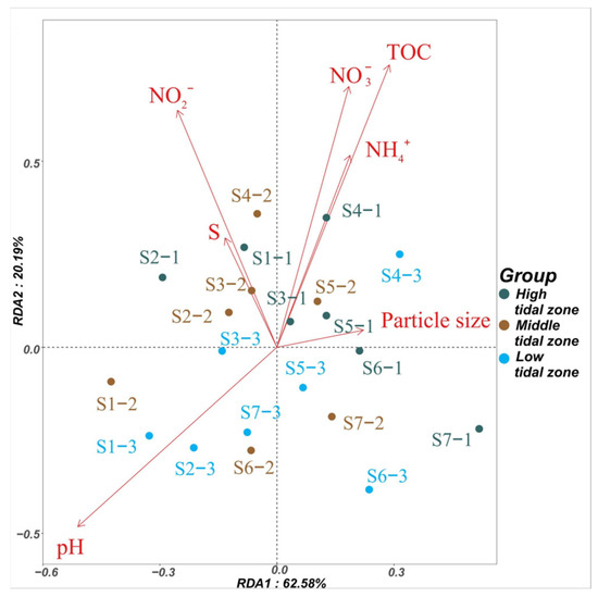Several environmental factors, such as TOC, particle size, pH, and nutrient composition, have been identified as influential factors affecting the distribution and persistence of antibiotics [46,50,51]. In this study, the physicochemical properties of mangrove sediments were analyzed and are shown in Table 1. The pH of the high tidal zone was significantly lower than that of the middle and low tidal zones (p < 0.05), while the pH of the low tidal zone was the highest. The order of NO3−-N concentration was as follows: high tidal zone > middle tidal zone > low tidal zone, and there were significant differences between every two tidal zones (p < 0.05). The TOC concentration was the highest in the high tidal zone, followed by the middle and low tidal zones. Additionally, the NO2−-N, NH4+-N, and sediment particle size were the highest in the middle tidal zone, followed by the low and high tidal zones.