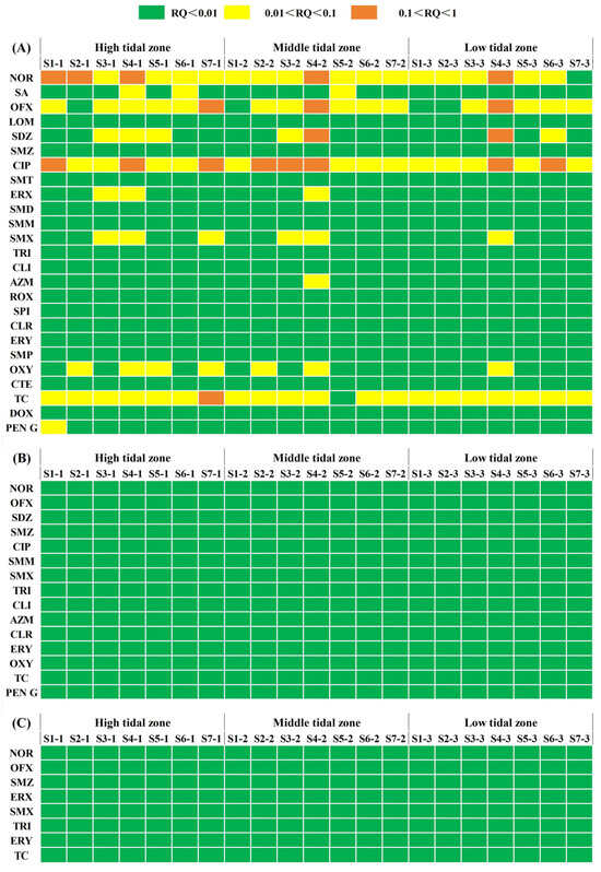 The potential ecological risks associated with target antibiotics were evaluated by risk quotients (RQs), using Equations (1)–(6) [1,90,91,92,93]. The risk levels were divided into four categories, i.e., insignificant risk (RQ < 0.01), low risk (0.01 ≤ RQ < 0.1), medium risk (0.1 ≤ RQ < 1), and high risk (RQ > 1) [94].