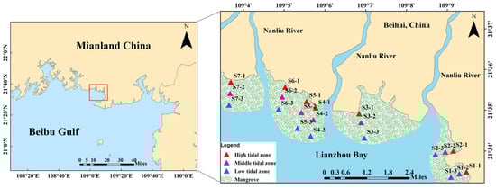 Location of sampling sites in the mangrove sediments of Lianzhou Bay, China.