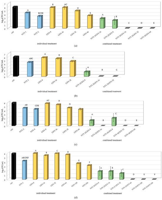 The results (Figure 2) showed a significantly lower number of adhered bacteria when combined treatment was applied, indicating successful inhibition of biofilm formation for all applied NTX/GEN combinations. Complete inhibition was achieved in 11 out of 19 tested combinations. The statistically significant inhibition was accomplished for all four tested strains, but not to the same extent. The inhibition was combination-dependant and generally, the increase in GEN concentration for the fixed NTX concentration enhanced the inhibition. On the other hand, doubling the NTX concentration for the fixed GEN amount did not yield statistically significant differences (Figure 2a,c).