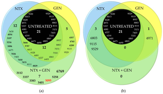 Venn diagrams of four tested Enterococcus faecalis ATCC29212 mutants (untreated; treated with nitroxoline, NTX; treated with gentamicin, GEN; treated with NTX/GEN combination) and their significantly (a) upregulated and (b) downregulated peaks. The four-digit numbers represent the m/z positions of peaks extracted from matrix-assisted laser desorption/ionization time-of-flight mass spectrometry (MALDI-TOF MS) spectra shown in Figure 4. Bolded values represent peaks not present in the untreated strain. Single- or double-digit numbers represent the total peak count in the particular category. Red number designates the peak found in vanB-positive isolate of Enterococcus faecium.
