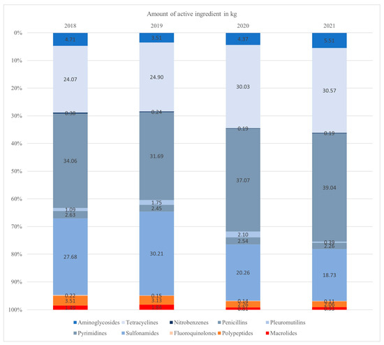 Based on the amount of active ingredient used, the largest proportion of AMU was attributed to penicillins each year, followed by sulfonamides and tetracyclines. Between 2018 and 2019, the consumption of sulfonamides was higher than the consumption of tetracyclines. However, in the years 2020 and 2021, the consumption of tetracyclines exceeded that of sulfonamides. Other than sulfonamides, the antimicrobial classes of tetracyclines and penicillin did not exceed 15% in total.