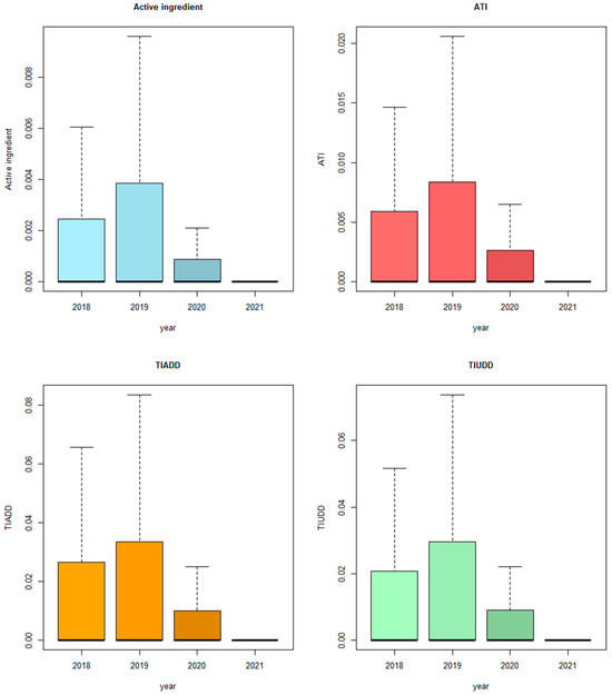 In summary, the analysis showed a significant decrease in active ingredient consumption in kilograms in 2021 compared to all the previous years, while there was a significant increase in 2021 based on the indicators TIADD and TIUDD, respectively, and a significant increase between 2021 and 2018 for the ATI indicator.
