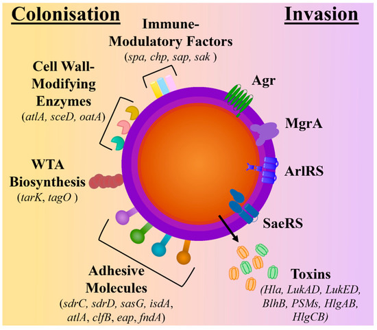 Comparison of molecular factors upregulated during colonisation and invasion. The schematic depicts the surface proteins known to be upregulated during colonisation and includes adhesive molecules, wall teichoic acid (WTA) biosynthesis molecules, cell wall-modifying enzymes, and immune-modulatory factors. In contrast, during invasion, the regulatory systems (Agr quorum-sensing systems ArlRS, SaeRS, and MgrA) are upregulated, which controls the expression and secretion of toxins.