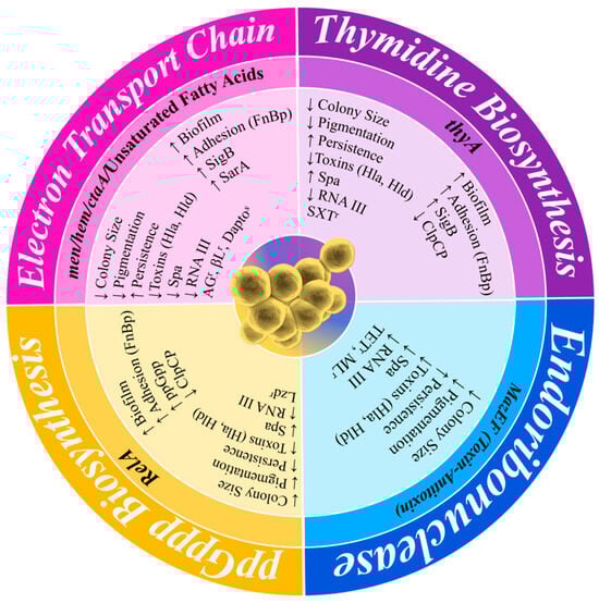 - Tuchscherr, L.; Loffler, B.; Proctor, R.A. Persistence of Staphylococcus aureus: Multiple Metabolic Pathways Impact the Expression of Virulence Factors in Small-Colony Variants (SCVs). Front. Microbiol. 2020, 11, 1028. [Google Scholar] [CrossRef]