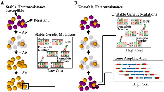 The current understanding is that heteroresistance results from a few different mechanisms can be categorised as either stable (where resistance persists after the removal of the antibiotic stress) or unstable (where the population reverts back to an antibiotic susceptible phenotype after the antibiotic selection pressure has been removed) [135] (Figure 5). Stable heteroresistance is frequently observed to be a result of mutations that are typically genetically stable, such as single-nucleotide polymorphisms (SNPs), frameshifts, insertions, and deletions [135]. These mutations generally have a marginal impact on the fitness cost, allowing the subpopulation to remain resistant to specific antibiotics even once the stress has been removed. These stable phenotypes have been observed in both Gram-positive bacteria such as S. aureus (e.g., hVISA) and Gram-negative bacteria such as Acinetobacter baumannii [134]. Alternatively, unstable heteroresistance is thought to be a result of spontaneous, genetic, tandem amplification, where an increase in resistance genes present within the bacterial genome gives rise to increased resistance [137]. This unstable phenotype has been almost exclusively observed in Gram-negative bacterial species, such as Escherichia coli and Haemophilus influenzae, due to the spontaneous homologous recombination between repeated sequences in sister chromatids during replications [138]. Thus, amplified gene regions increase resistance corresponding to an increase in the gene dosage (such as genes encoding for antibiotic resistance, efflux pumps, or antibiotic-modifying/-degrading enzymes) [139]. However, due to the high fitness cost of amplification, the gene is de-amplified when the stress is removed [140].