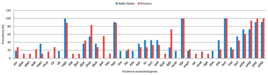 A total of 72 different VAGs involved in adhesion (n = 23), protection against environmental stress and host immune response (n = 32), toxin production (n = 9), and in iron acquisition (n = 8) were identified in the E. coli isolates tested in this study. On average, all E. coli isolates carried 16 different VAGs, with a minimum of 7 and a maximum of 28 VAGs. The terC gene, which encodes for the tellurite resistance, and the nlpI gene, which encodes an outer membrane lipoprotein, were identified in all isolates tested. A total of 28 (96.6%) of the isolates contained yehC (chaperone, YhcD fimbrial cluster), 27 (93.1%) csgA (curlin major subunit CsgA), 26 (89.7%) hlyE (avian E. coli haemolysin), and 25 (86.2%) yehB (usher, YhcD fimbrial cluster). Forty-one of the total virulence-associated genes were detected in isolates from Hossana and Addis Ababa (Supplementary Table S1). Only seven genes, including the cdt-IIIB gene, which encodes the CdtB subunit of the cytolethal distending toxin complex, cib gene, which encodes a protein that protects E. coli cells from the cytotoxic effects of the cloacin DF13 bacteriocin, colE5 (colicin E5 lysis protein Lys), etsC (putative type I secretory outer membrane protein) and mcbA (bacteriocin microcin B17) were detected exclusively in isolates from Addis Ababa. However, 27 different genes, including capsular polysaccharide-related genes (kpsE, kpsMII, and kpsMII_K5), the tia gene that encodes the Tia (toxigenic invasion locus) protein, which is involved in the adherence and invasion of host epithelial cells, and the usp (uropathogenic specific protein), were exclusively detected in isolates from Hossana (Supplementary Table S1). The most frequently detected VAGs (greater than 10%) in E. coli isolates from Addis Ababa and Hossana are presented in Figure 2. The study found that 28 VAGs were detected in 18.2% to 100% of the E. coli isolates from Addis Ababa, while 36 VAGs were detected in 11.1% to 100% of the isolates from Hossana.